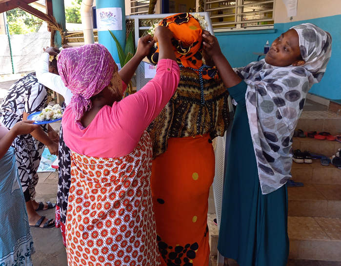 Partenaires incontournables, les parents d’élèves ont fait preuve de collaboration à l’égard de l’équipe. Ici, afin de marquer la journée, une enseignante (vue de dos) se fait embellir de fleurs de jasmin par des mamans dévouées à la cause des enfants.